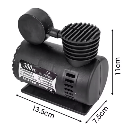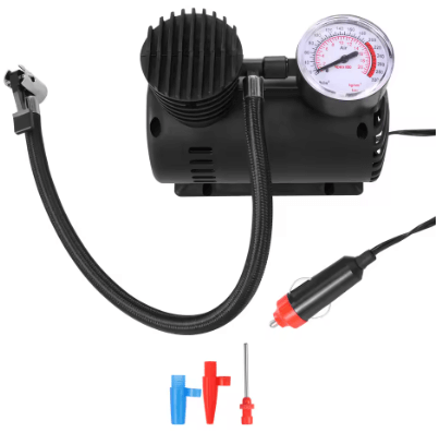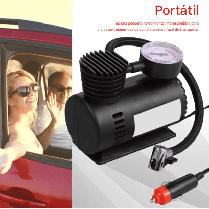 Incluye el mini compresor portátil, manguera de inflado, cable con conexión a encendedor de carro (12V) y boquillas adicionales para inflar llantas, bicicletas, balones y otros inflables.